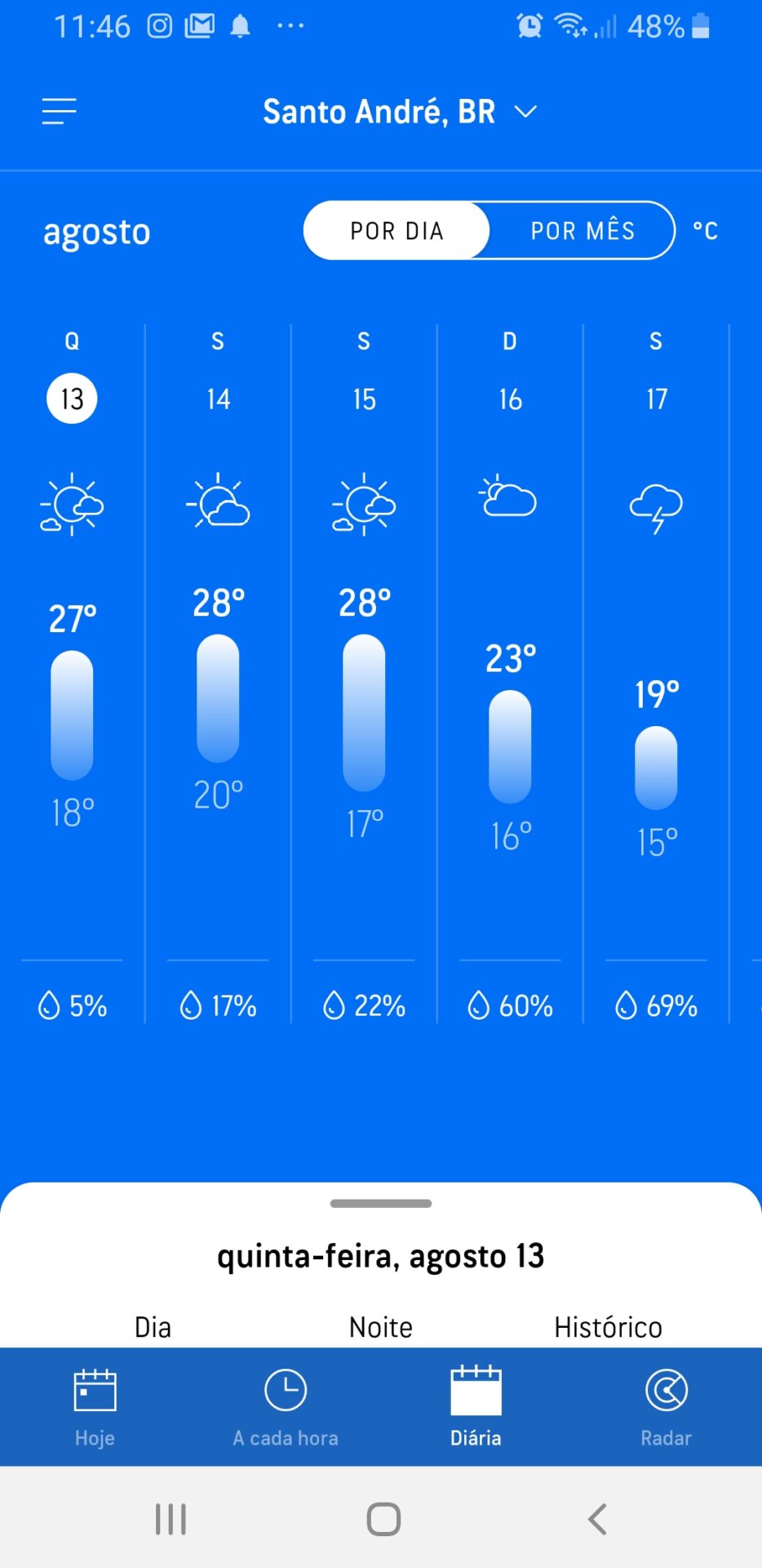 Mas o que eu mais gosto é a informação hora a hora, onde o app dá os dados previstos para cada hora do dia. Oras de que adianta informação de máxima e mínima se a mínima será justamente na hora em que eu estiver dormindo?
