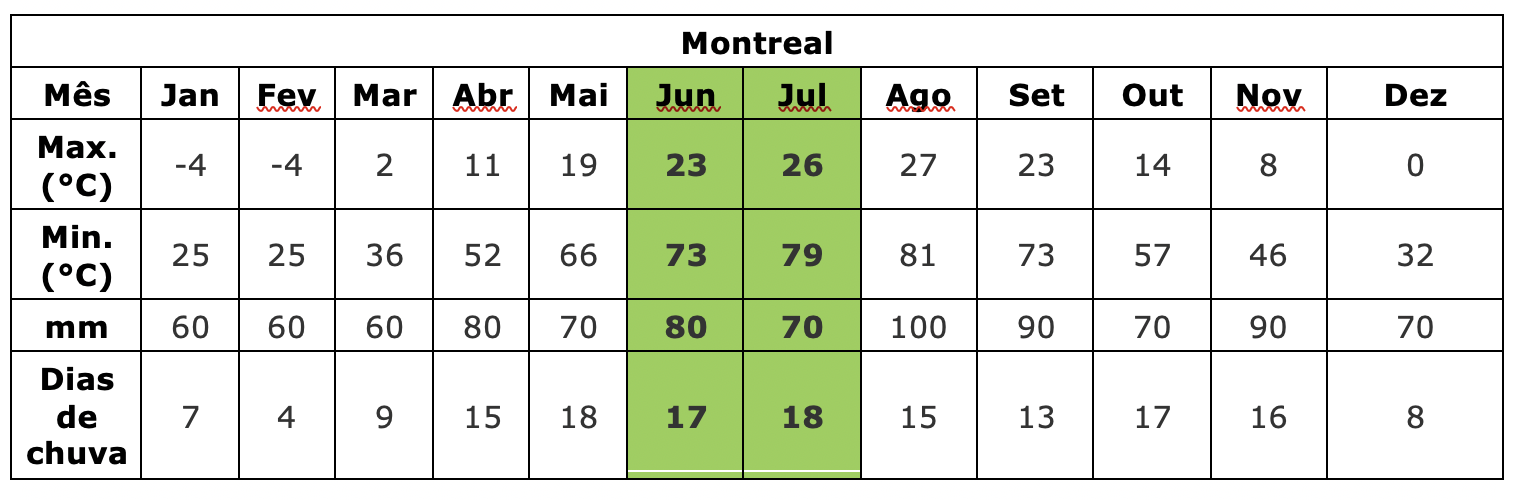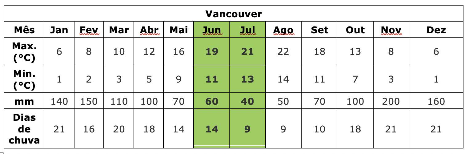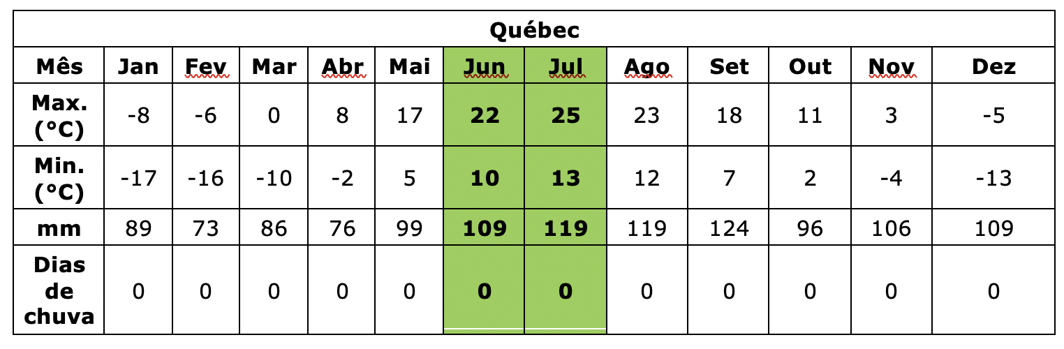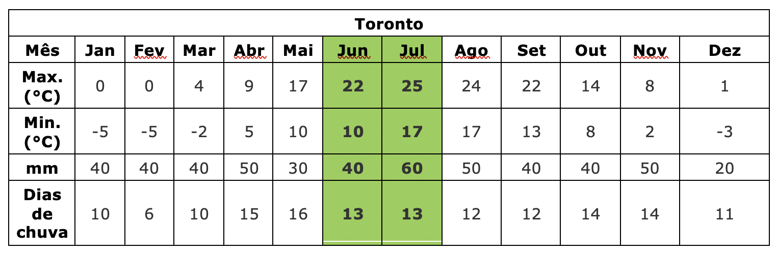 Abaixo você encontra as médias de temperatura e precipitação para os destinos que visitamos, o que dá uma noção de como é o clima em alguns dos principais destinos no Canadá: