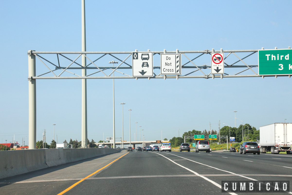 Normalmente nas estradas o limite de velocidade fica entre 120/80km, mas em Ontário é 100/80km.