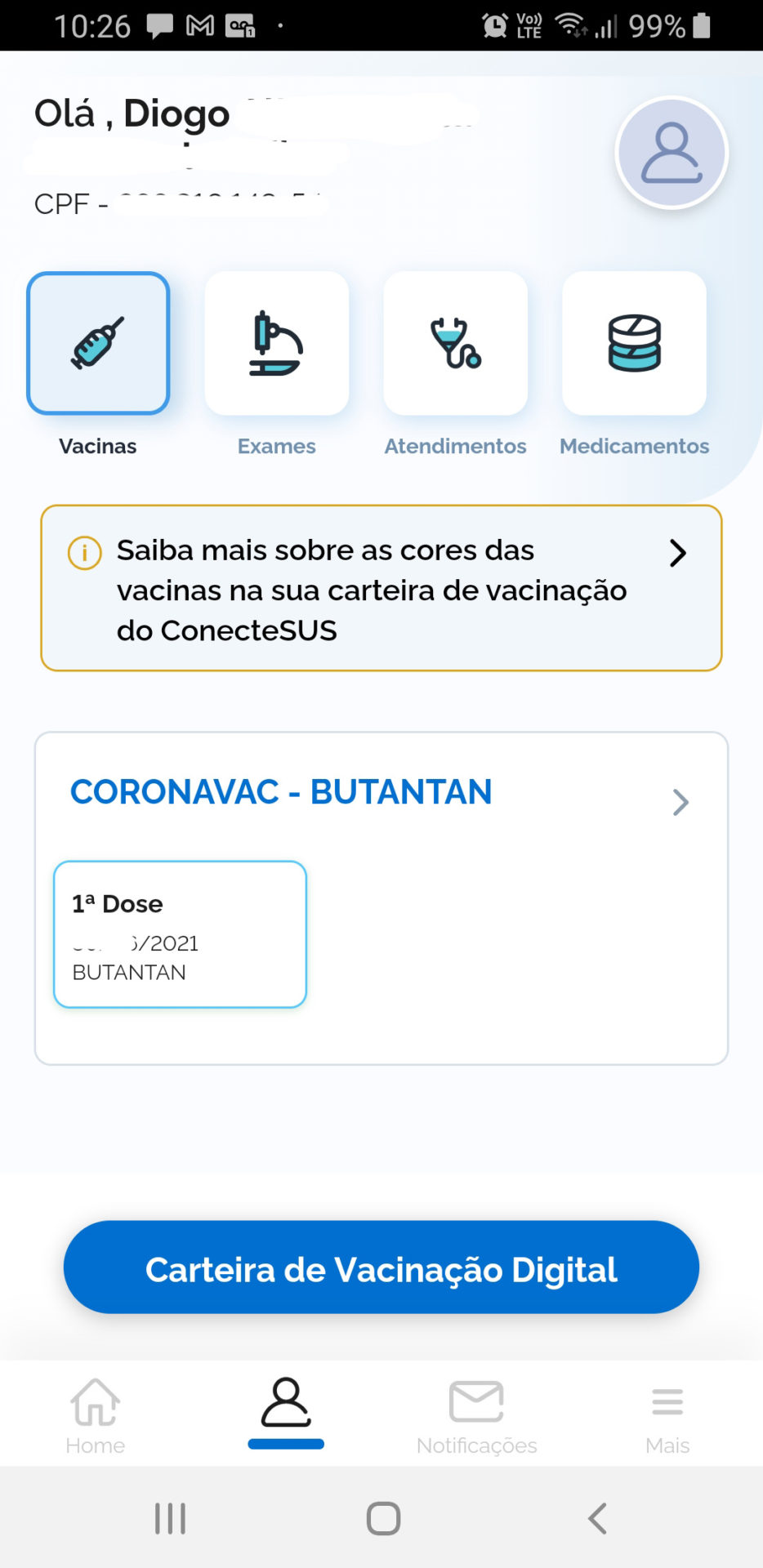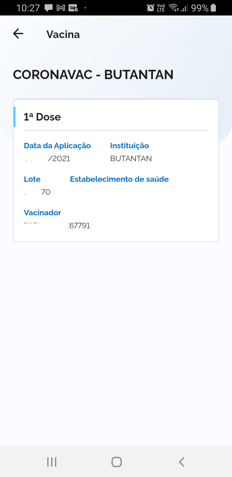 Atente-se ao fato de que dependendo do posto de saúde onde você tomar a vacina, pode haver um atraso de até 10 dias no lançamento da vacinação. No meu caso, menos de 2 horas depois da vacinação contra a Covid-19, o sistema já acusou a aplicação. Já a da Sra. Cumbicona 3 dias depois ainda não havia aparecido no sistema.