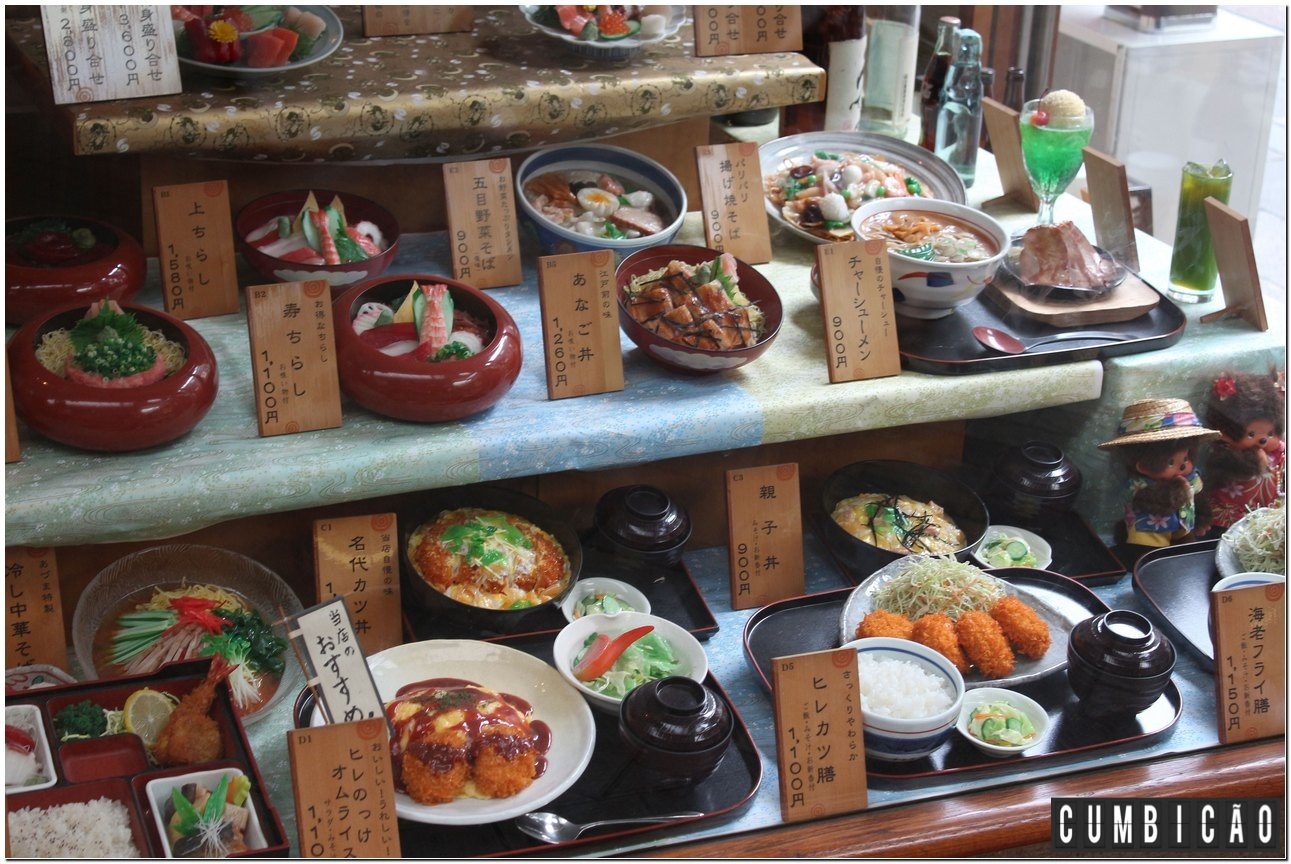 Legal, tudo bom e nutritivo, mas como escolher os pratos. Bem se tem algo típico em relação a comer no Japão são as comidas de plástico expostas nas vitrines dos restaurantes. Pois é, não sei se para chamar a freguesia ou sei lá o que, o fato é que com tais reproduções fiéis – e porque não artísticas – dos pratos, eles acabaram facilitando e muito a vida dos turistas.