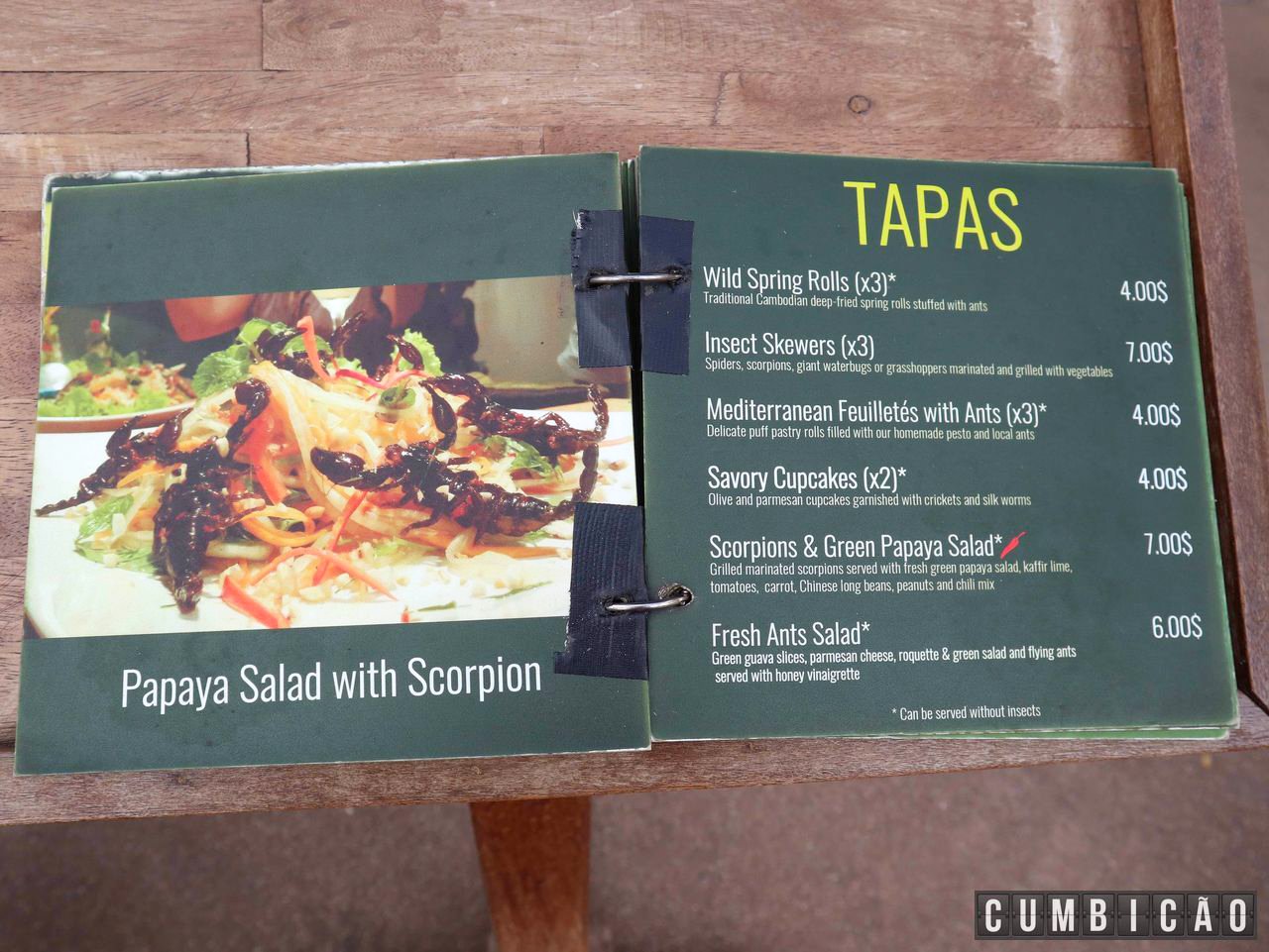 E se você quiser ver (e talvez comer) insetos??? Tem um monte de banca nas ruas, mas você pode ir direto à fonte: o Bugs Cafe (Steung Thmei St) nem que seja para ver, vale conferir o restaurante que como o nome diz vende insetos.