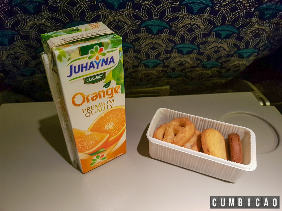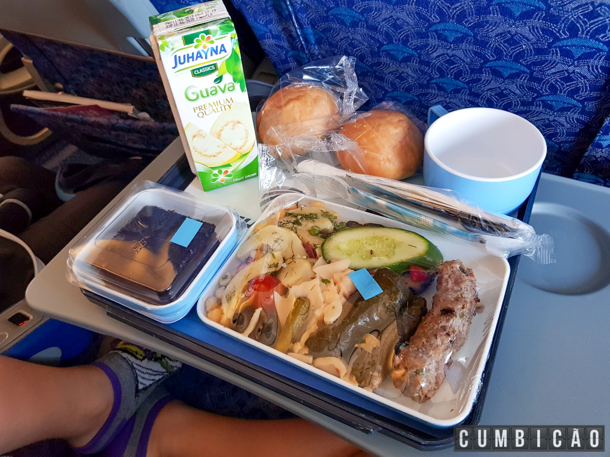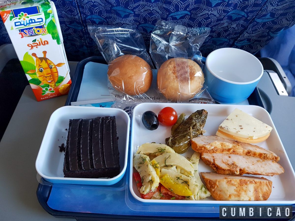 Nos voos domésticos serviram um suco de caixinha e algumas bolachinhas, já no voo internacional ai sim, serviram uma refeição de verdade e realmente saborosa: peito de frango com queijo e um charutinho; ou massa com kafta (ambas opções com um bolinho de chocolate bem gostoso). Excelentes!