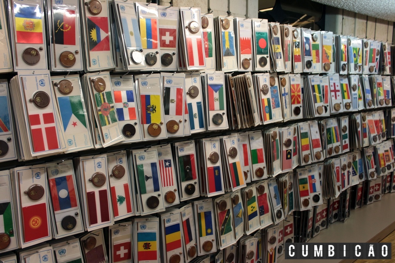 Ali, além das óbvias camisetas, pins e bonés com tema da ONU; muitos livros, mapas e bandeiras. Como dentre outras coisas, coleciono pins das bandeiras dos países visitados, aproveitei para comprar o de Andorra que não pude comprar in loco. A vontade era comprar todos, mas a tradição manda comprar no país visitado! Kkkk