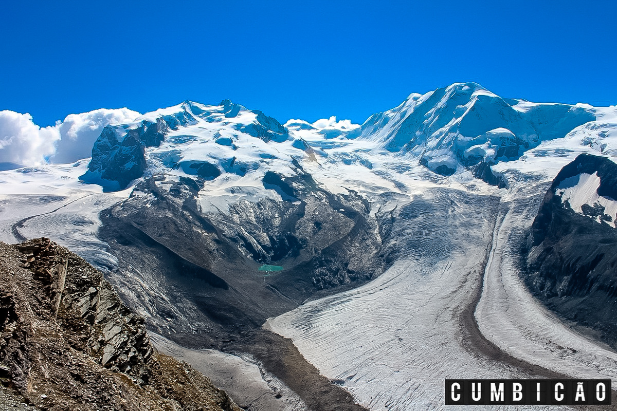 Numa espécie de vale, que na verdade é um glaciar (Gornergletscher) que divide Gornergrat da cadeia de montanhas que está do outro lado fica a Itália.