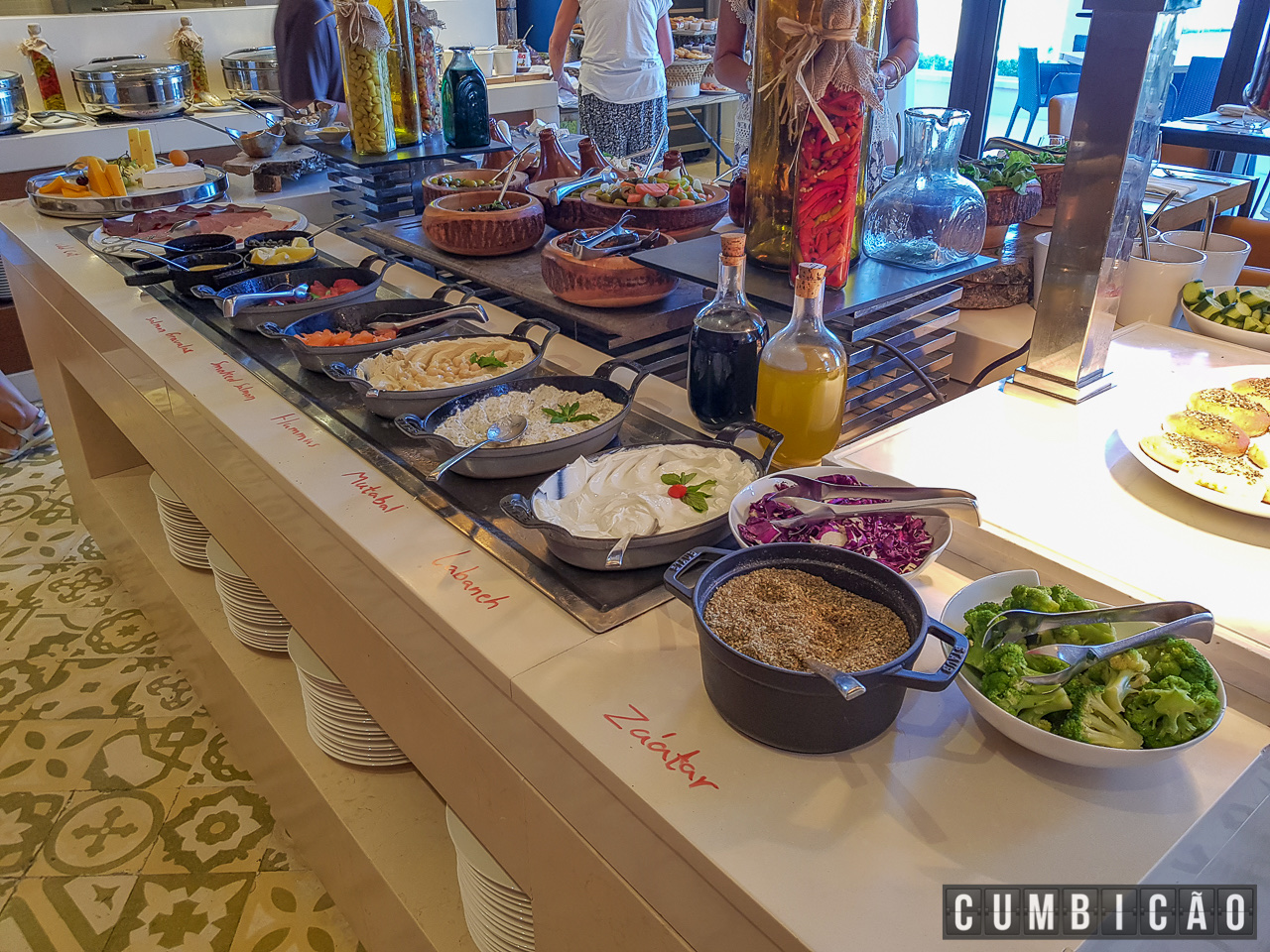 Servido em no Taybeh Al Manara Restaurant, um charmoso restaurante com vista para a piscina e lagoa (como eles chamam o braço de mar que adentra à propriedade), o café da manhã é maravilhoso.