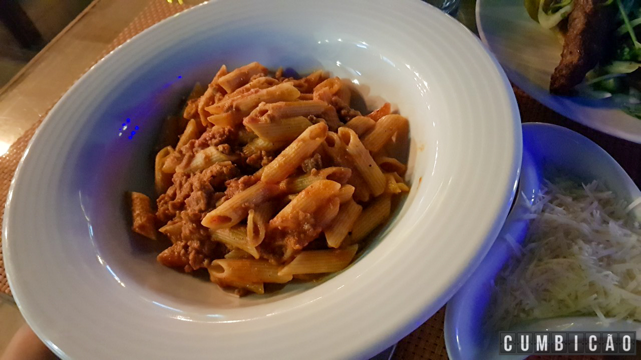 Mas o que me fez mesmo não curtir o restaurante foi o macarrão bolonhesa que pedimos para o Cumbiquinho… Perguntei mil vezes se não era apimentado (parece idiota, mas já conheço várias versões nada made in Italy por ai que nem te conto) e me disseram que não. Teimoso, insisti para não ser apimentado, só para ter certeza que daria tudo certo. Adivinha o que aconteceu? O macarrão era pura pimenta. Me explica por favor quem foi o “italiano” que ensinou eles a fazerem macarrão bolonhesa apimentado?