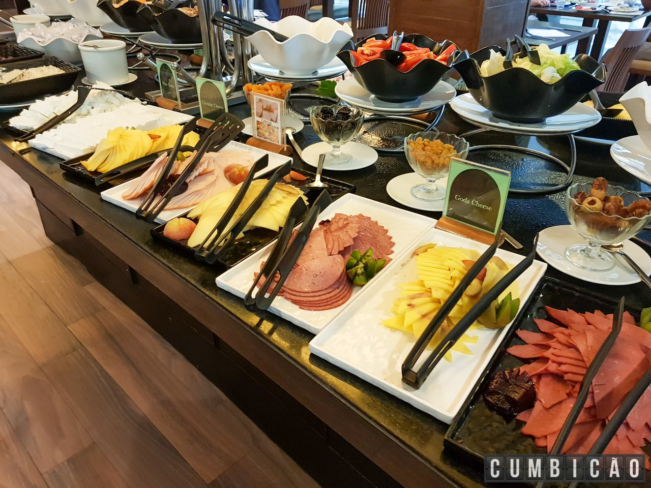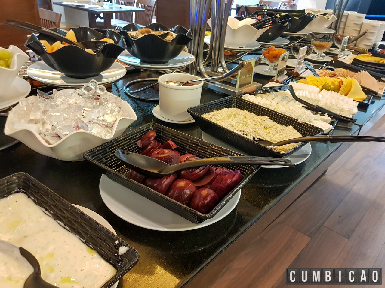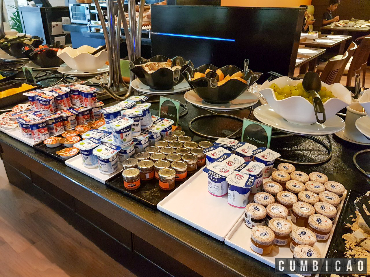 A quantidade e qualidades dos itens é bastante satisfatória: pães variados; frios; iogurtes; cereais; sucos; e frutas; além de alguns itens diferentes para muitas pessoas como salada 🤔. Só a oferta de frutas que eu realmente achei que ficou devendo, já que eram muito poucas opções.