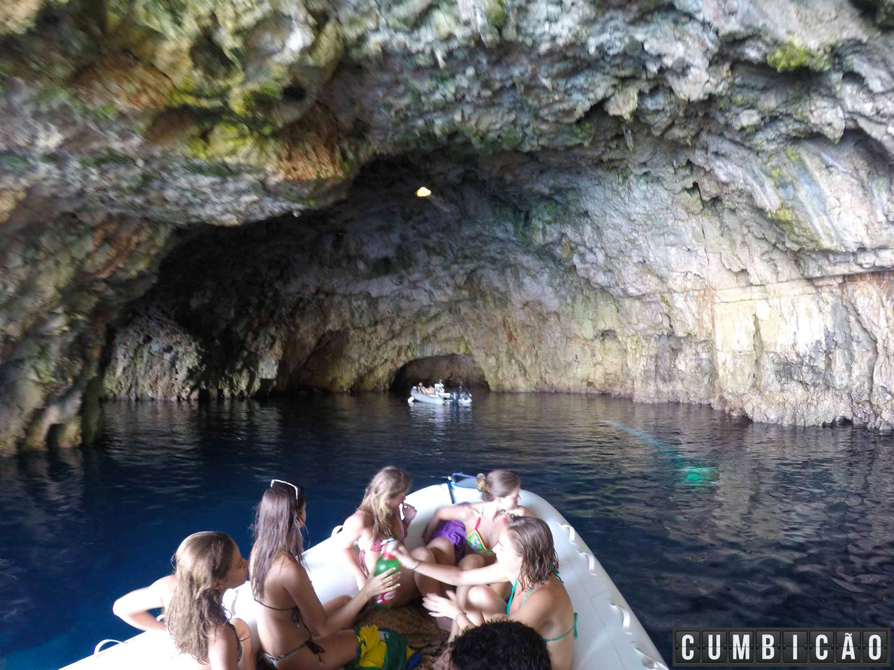 A nossa primeira parada foi na Gruta Azul, uma gruta que fica iluminada durante um período do dia. O grande truque da natureza e que dá este espetáculo é o fato de existir uma abertura subaquática pela qual a luz do Sol entra e pinta de azul toda a gruta.