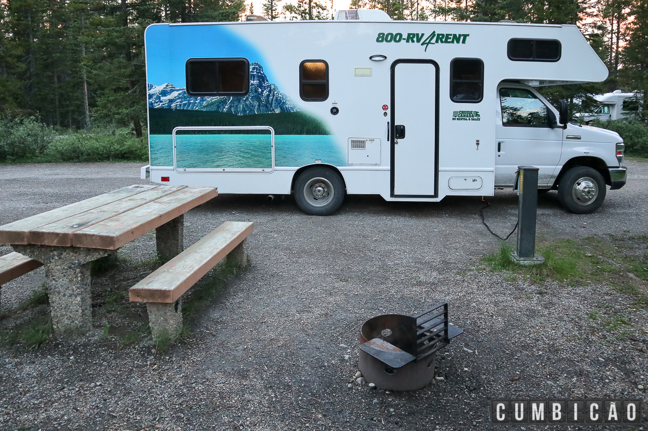 Situado a apenas 60km de Banff, ele tem uma infraestrutura bastante semelhante aos demais campings que usamos, contando com banheiros limpos com chuveiros, e as vagas para motor-home têm ponto de eletricidade, mas não água (abasteça antes na sani-dump do próprio camping).