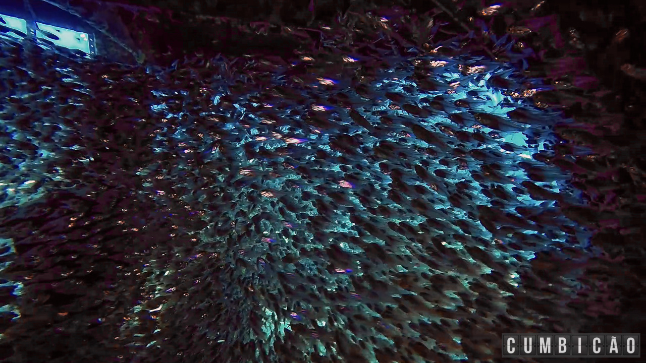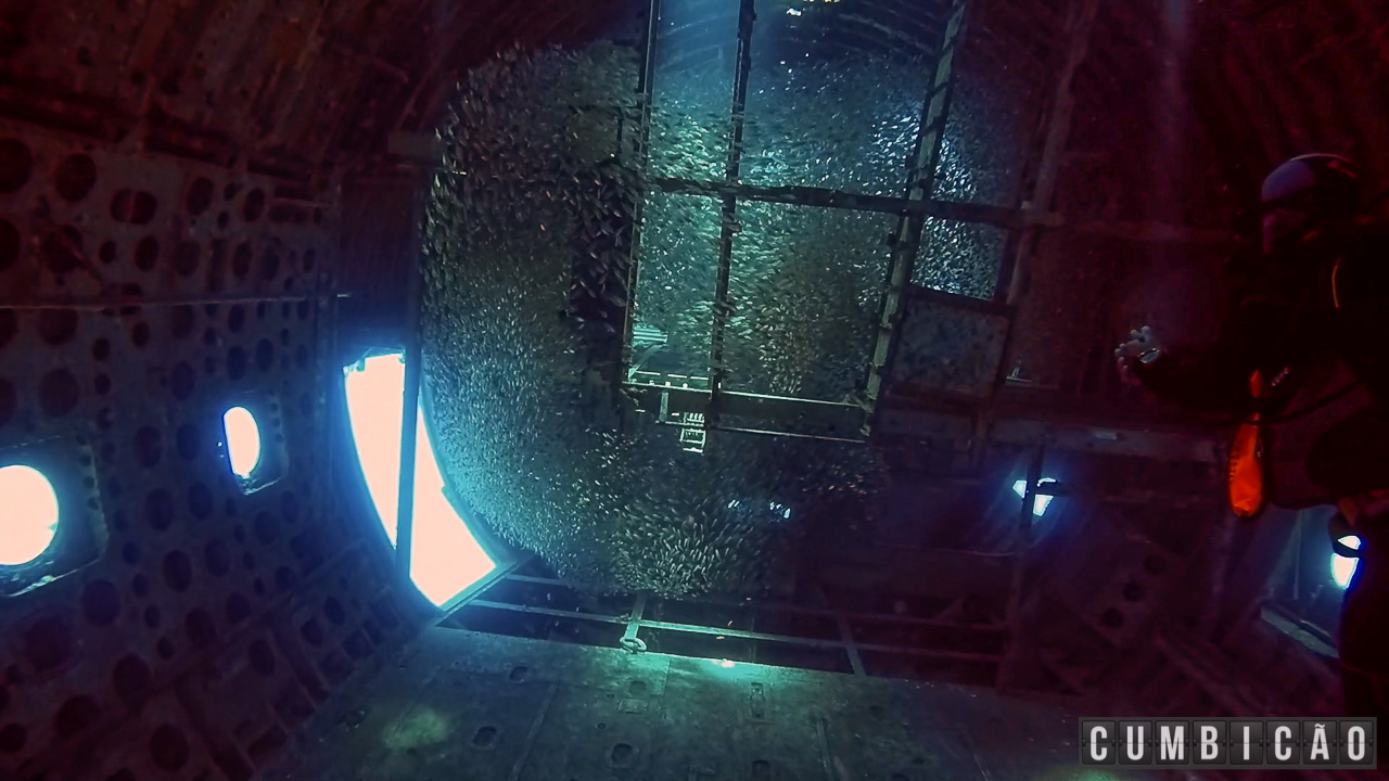 Repare na quantidade de peixes que parecem formar uma espécie de nuvem na cabine.