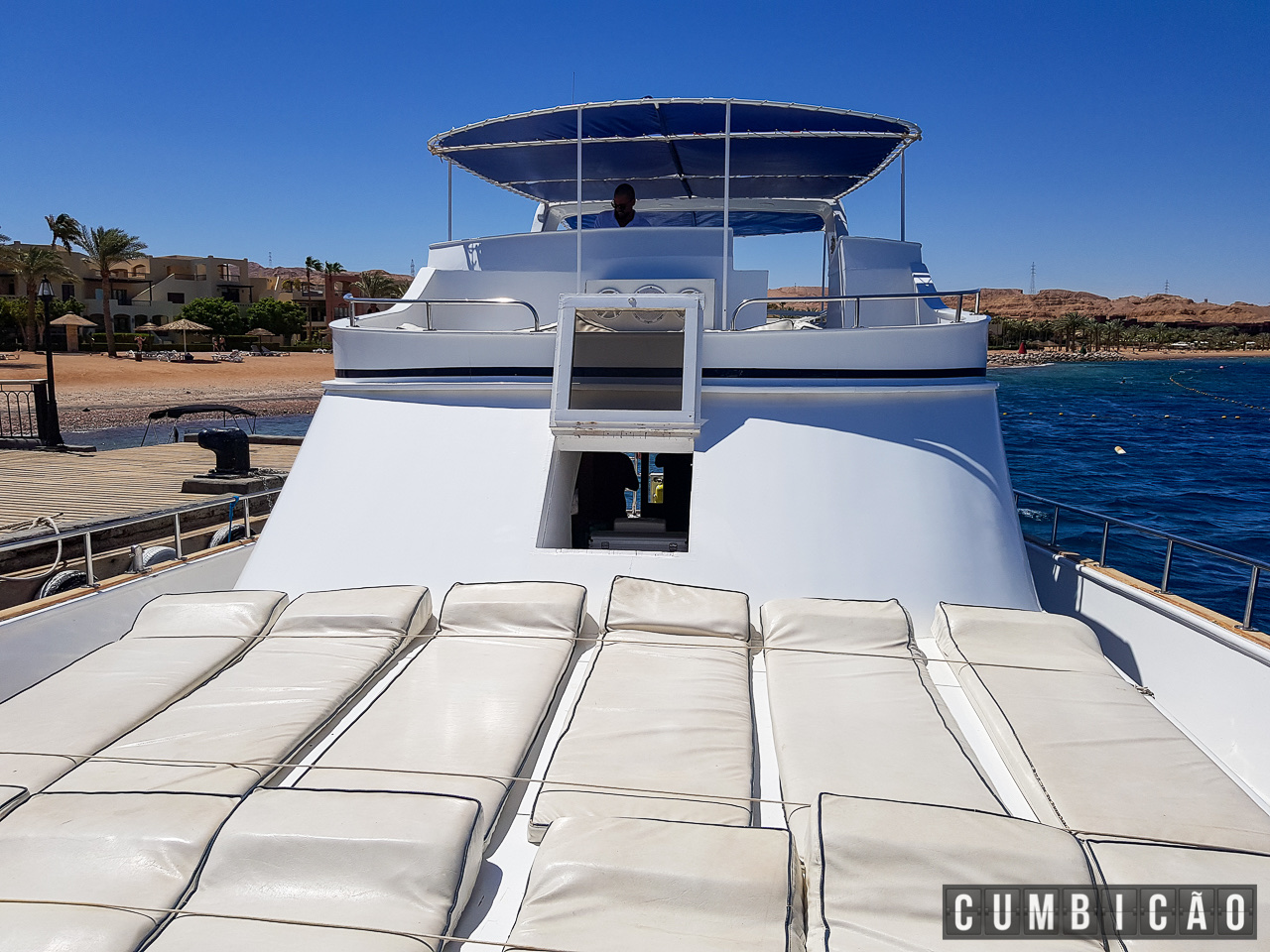 No meu dia, embarcamos no Deep Blue 210, um enorme barco com 21m de comprimento e capacidade para 33 mergulhadores. Conta com banheiros, chuveiros, cozinha completa, e um deck para tomar sol entre os mergulhos.