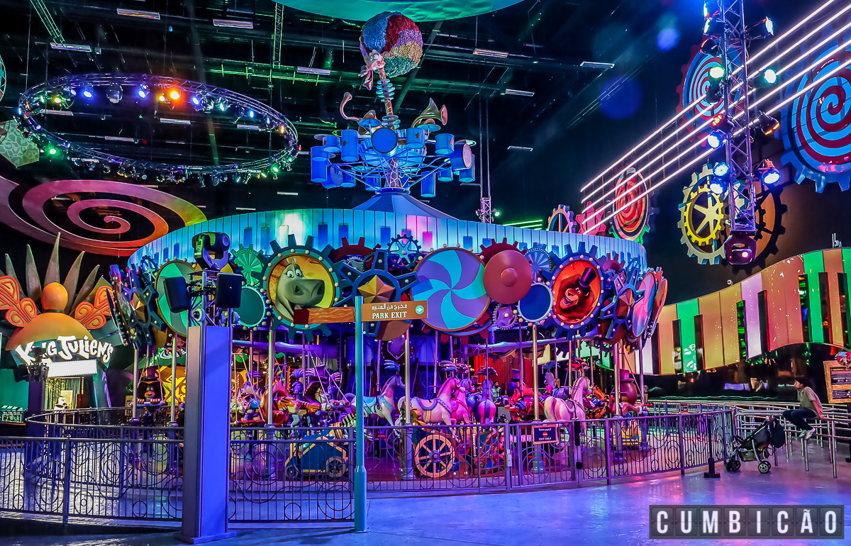Seguindo no sentido horário, chega-se ao universo de Madagascar que conta com 3 atrações e é toda ambientada em um cenário de circo super colorido e iluminado. Um deleite para os olhos.