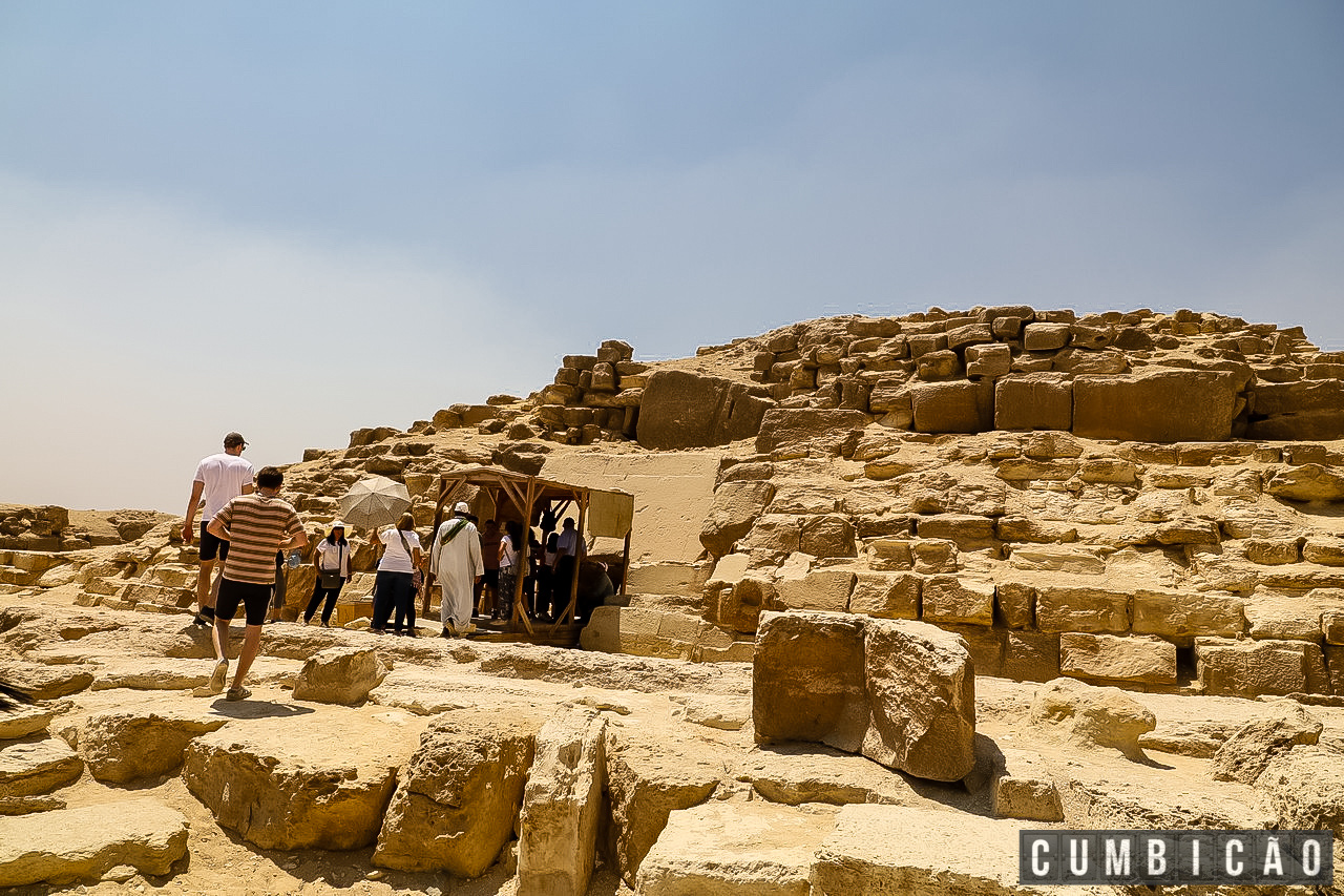 Olhando a pirâmide de perto você notará um buraco no meio de uma das faces, é uma das portas. Ela está assim no alto porque era onde estava a areia muitos séculos atrás. A porta original é mais para baixo.