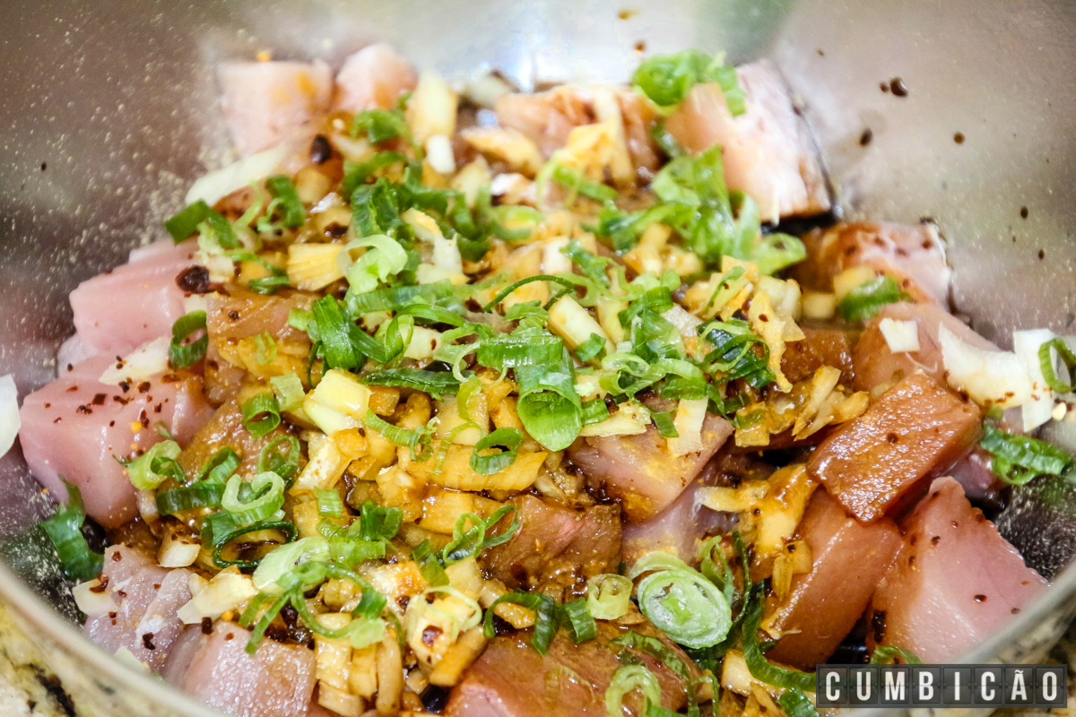 Num recipiente, misture o peixe em cubos ao tempero: cebola picada, cebolinha, lascas de gengibre, gergelim, e vá adicionando o óleo de gergelim e shoyu a gosto. Misture bem e pronto.