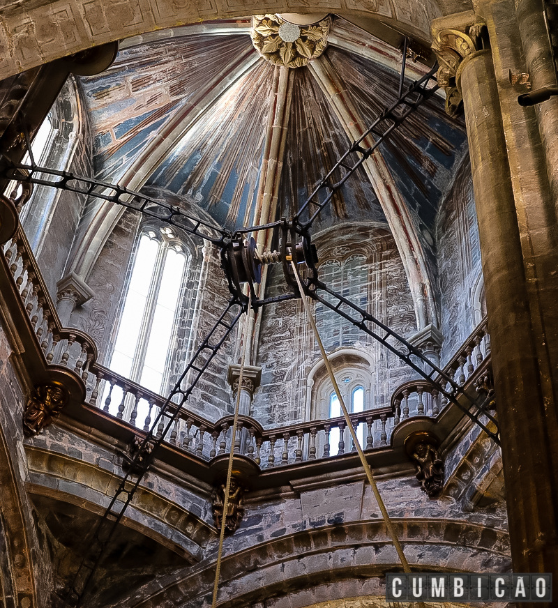 Foi então que bolaram um sistema super complexo para a época onde roldanas não só facilitavam o levantamento como também o balanço do incensário que como dá para ver é enorme.