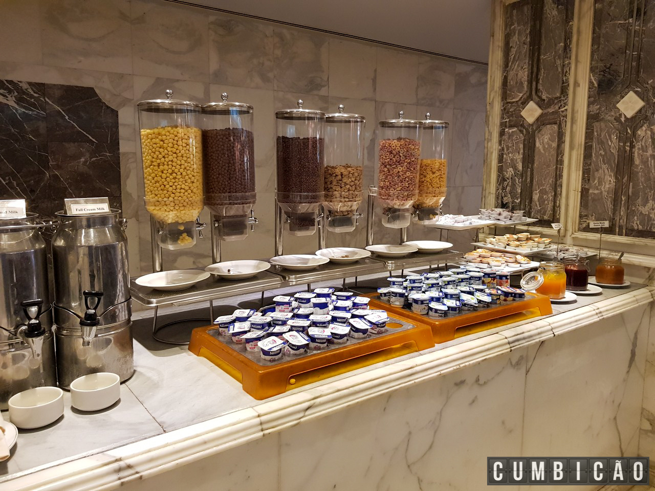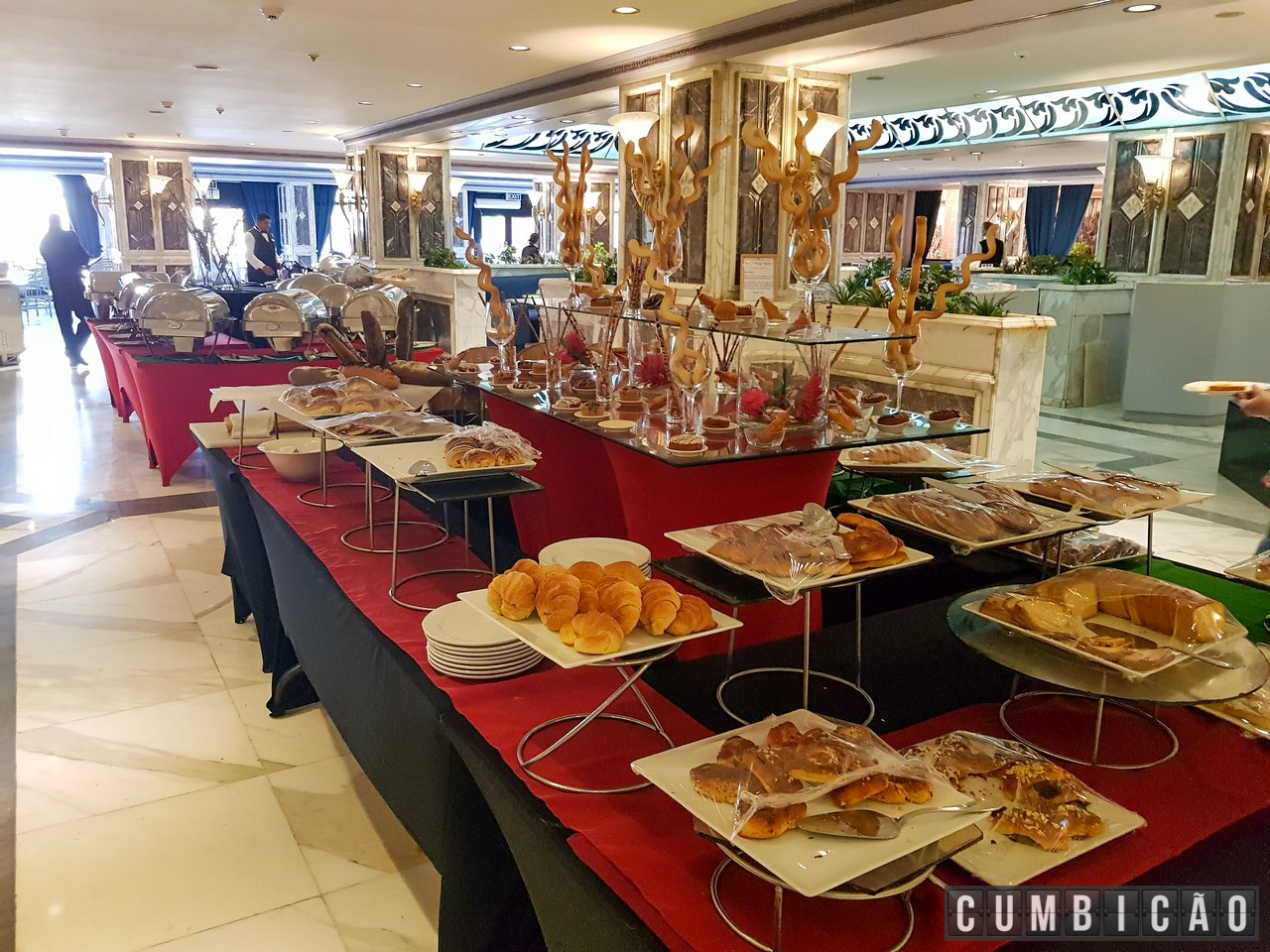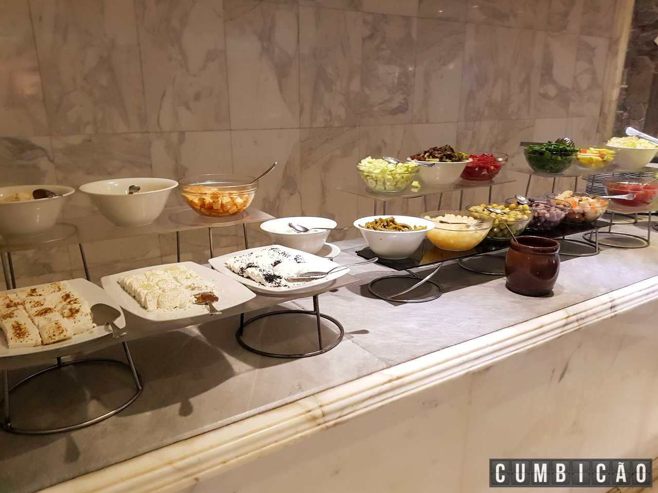 Servido em no Serapis, um amplo restaurante diante da piscina (o hotel tem outros 2 restaurantes), a variedade de itens é enorme.