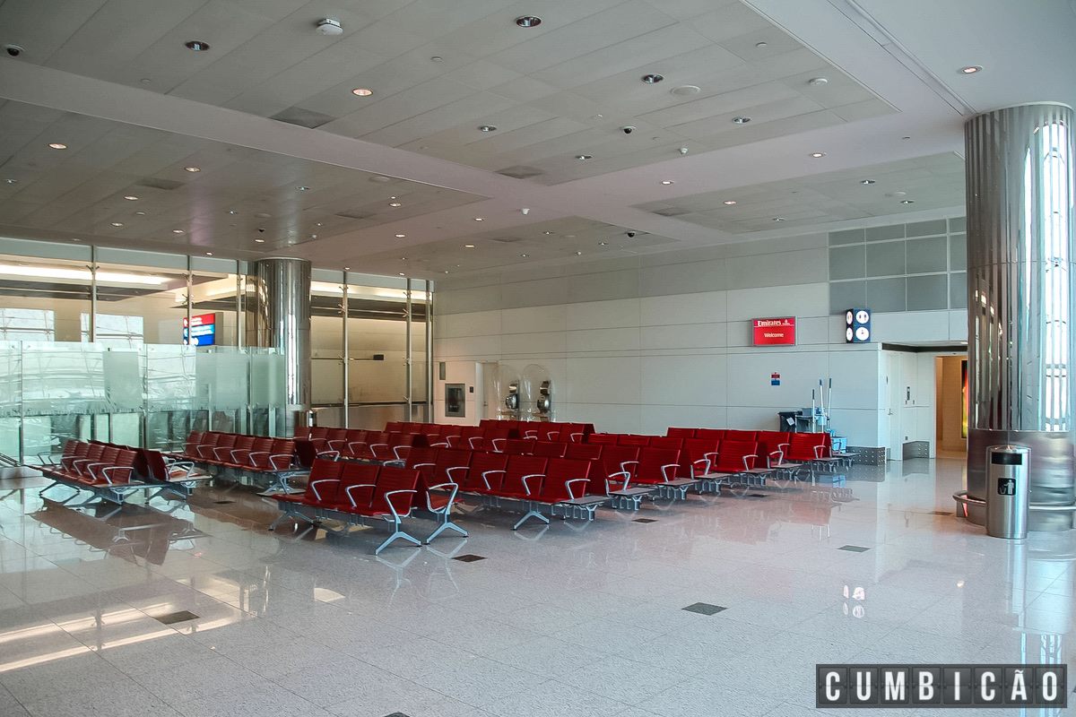 O principal terminal para voos internacionais é enorme e tem uma grande vantagem, além da sala de embarque superior, que pode até parecer pequena, há uma segunda muito maior. Por que disso? Pensando nos mais de 100 aviões A-380 da Emirates e sua enorme capacidade de passageiros.