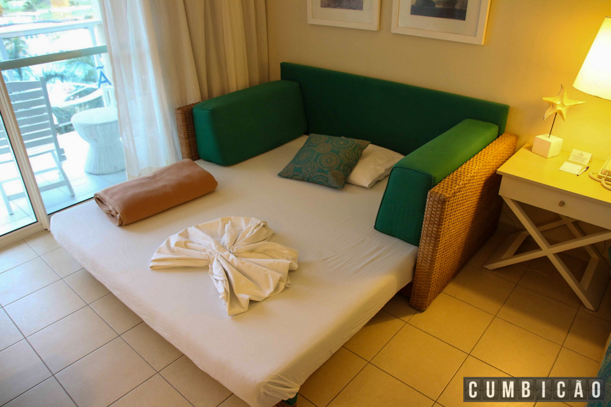 É um quarto grande, com 43 m2 e espaço suficiente para uma cama de casal e um sofá-cama que serviu super bem de cama para o Cumbiquinho sem atrapalhar a circulação. Fora isso ainda tem uma sacada de onde se tem uma vista interessante do complexo da piscina e do mar.