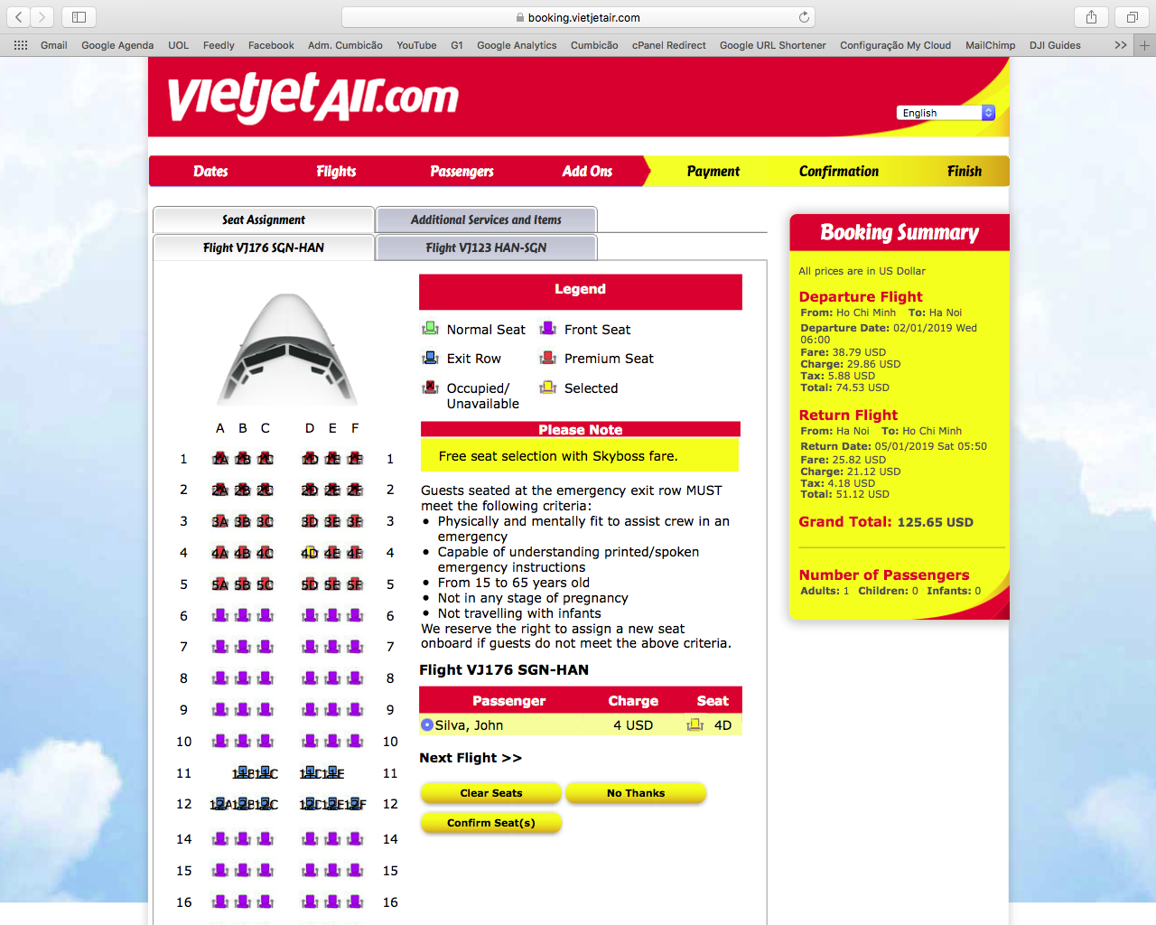 Preenchidos os dados do passageiro, o site te encaminha para a opção de escolha do assento. Aqui um detalhe. Embora eu considere um absurdo as empresas cobrarem por isso, como já falei reiteradas vezes, há um diferencial na Vietjet Air: eles cobram US$ 4 pelo assento mais caro da aeronave. Cobrar é errado, mas cobrar pouco fica “menos pior”.